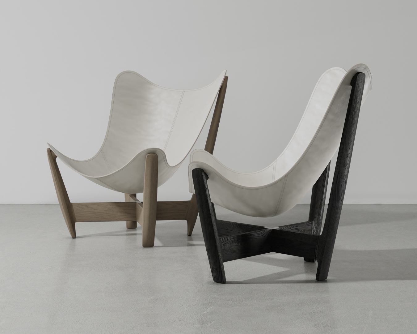 The sculpted leather seat takes its form from buồm — the full sails of traditional Vietnamese boats — appearing to rest effortlessly against the angled legs. Crafted with precision, the seat seems almost to float, while the solid oak frame provides strength and stability beneath. Cross stretchers introduce a subtle visual tension, complementing the soft, undulating lines of the leather.
