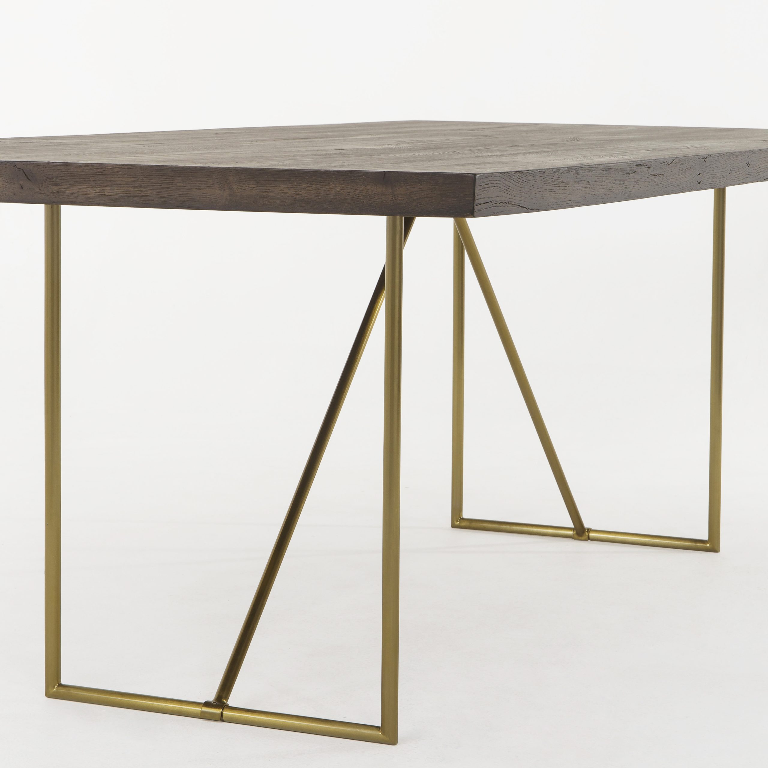 The Bridge Collection represents a beautiful balance between clean bold lines and a mix of materials; showcasing a rich palette of Oak veneers finished in a deep French Espresso stain, with a frame crafted from stainless steel in a brass finish.